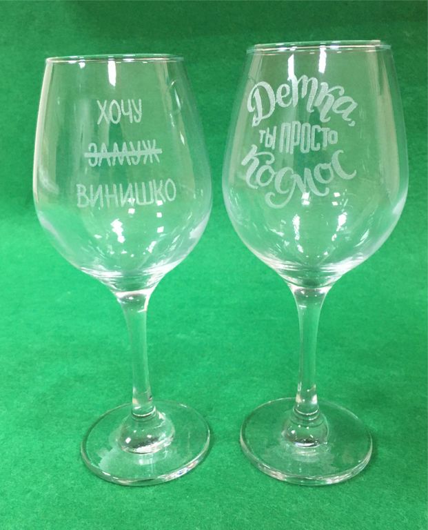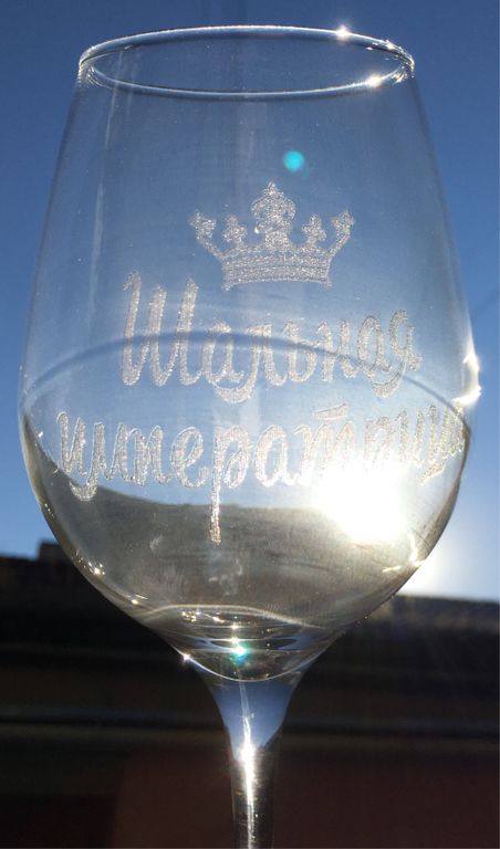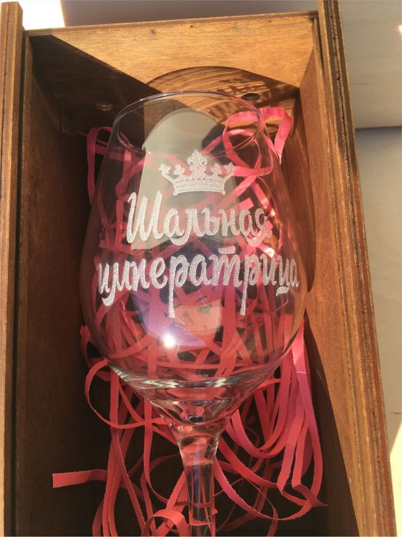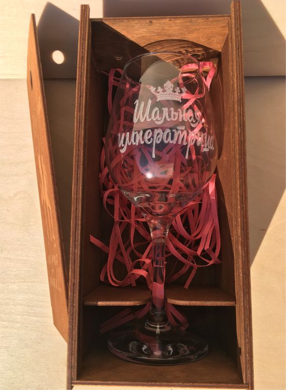 Стекло. Лазерная гравировка. Надпись, изображение на бокале и коробке индивидуальные, на выбор.